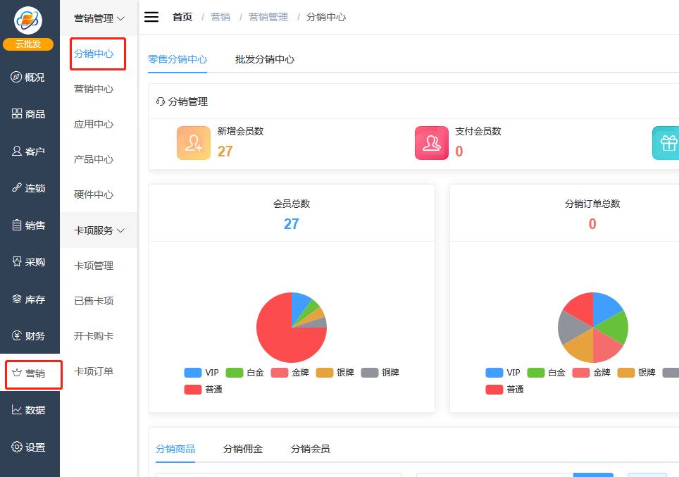 分销数据查询:企业进入分销中心可以对下游分销商进行数据分析,通过分销会员、分销商品、会员佣金这些数据来调整分销策略,分销会员展示的是商城下所有分销员的信息,分销商品可以看到被分销并成功下单的商品都有哪些,哪个商品销量高,会员佣金分析。