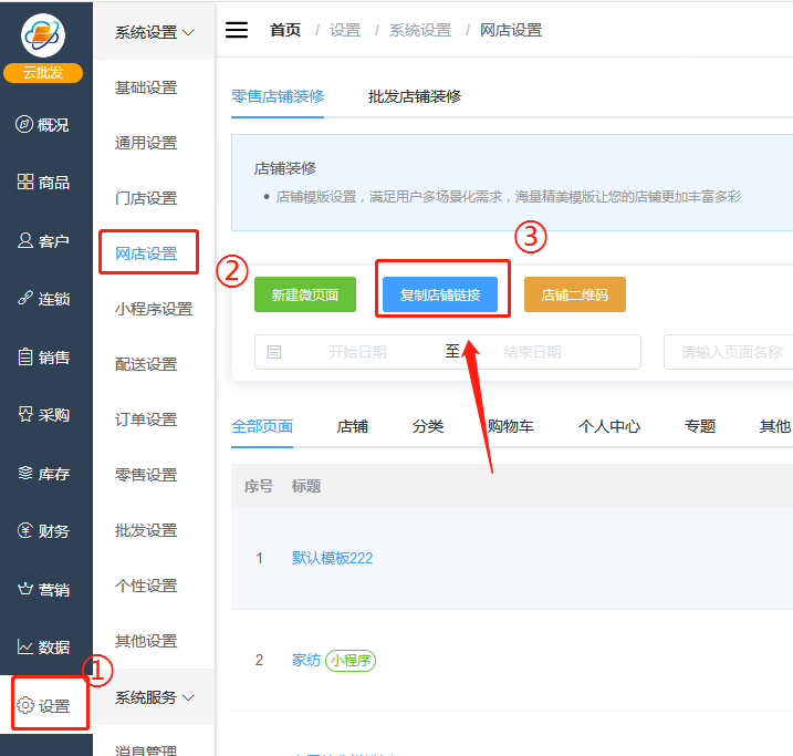 第一步:首先,我们需要获取到分销商城首页链接,登录管理后台,找到【设置】→【网店设置】→【复制店铺链接】