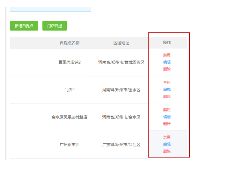 ③点击删除代表彻底删除自提点,无法重新启用;