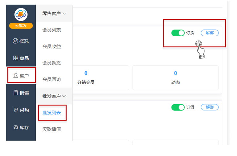 停用客户账号操作路径:【客户】→【批发列表】→【找到该进货商 - 关闭订货开关/点击解绑 】