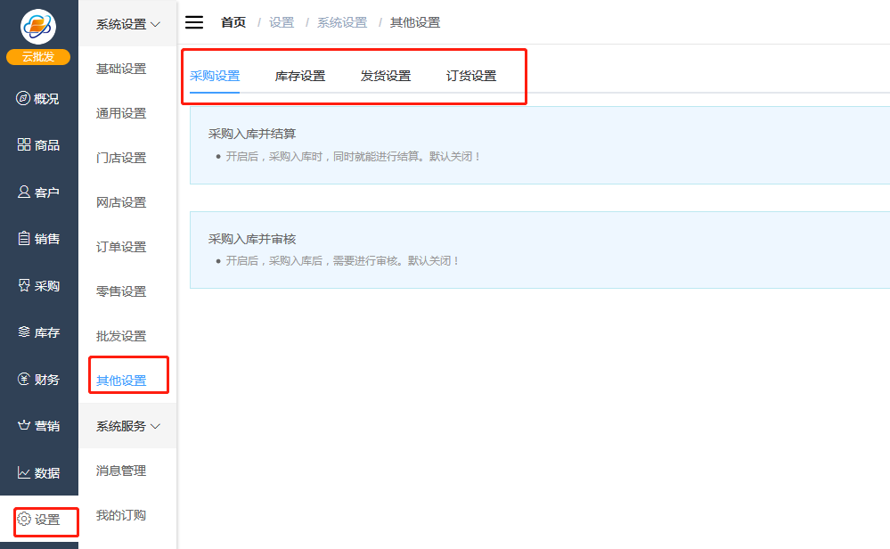 采购设置:针对采购入库的商品是否要审核以及是否有结算流程的两个开关;