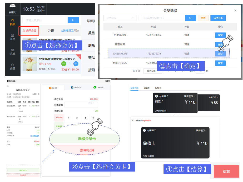 创建和发放过会员卡之后,我们接下来就来讲解如何使用会员卡结账,首先我们需要先【选择会员】→然后再【添加商品】→【点击结算】→【选择会员卡】→【结算】